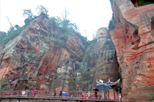 在那红砂岩壁上,弯弯绕绕盘旋的栈道上,人们在攀登,他们得以从大佛的上下左右近距离观赏它,也可以走上前去临时抱一下佛脚,虽然因为这佛实在太大,往往只能抱到一个脚趾头。他们大抵看不到大佛之全貌,只缘身在大佛中。而我们倒看到了大佛与游人形成的大景观,却又不能亲手触摸之。可见此事两难全。
